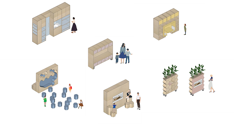 Het interieur wordt ingedeeld door middel van modulaire meubels, die voor elke plek specifiek zijn ontworpen. Ze dienen bijvoorbeeld als opslag of garderobe en creëren les- en leerplekken of doorzichten. De meubels sluiten aan op de houtconstructie en vormen multifunctionele wanden en in de onderwijsruimten.