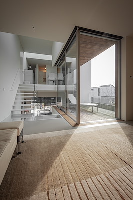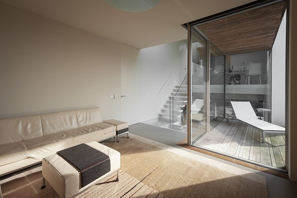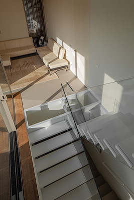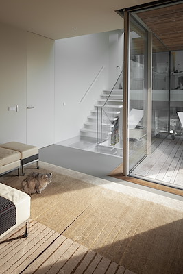 Het interieur is georganiseerd rond een centrale trap en naastgelegen kleine buitenruimte, die beide zicht bieden op alle ruimtes in de woning. Voor de raampartijen en puien zijn alleen de noodzakelijke stijlen en kozijnen gebruikt, drempels ontbreken. De balustrades van de trappen zijn helemaal van glas, zodat zij het doorzicht niet verstoren.
