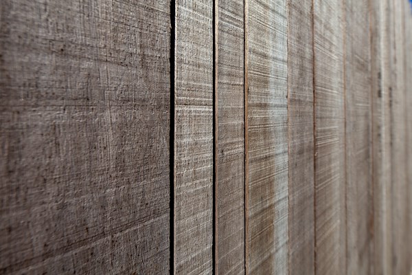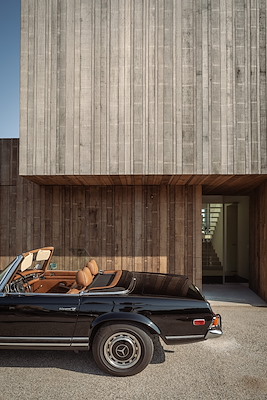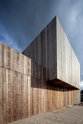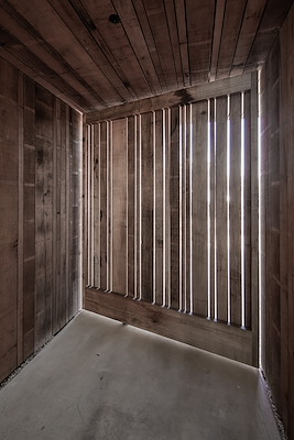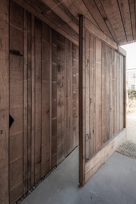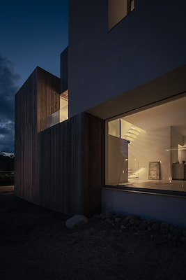 De zorgvuldig gedetailleerde villa is gematerialiseerd in ruwe, maar tegelijkertijd elegant ogende gevelmaterialen. De voorzijde bestaat uit houtelementen die iets uit elkaar zijn geplaatst, het licht in de woning ’s avonds via de achtergelegen ramen doorschijnt. De achterkant is gestukt in kalkpleister met een rauwe textuur die van afstand evenwel steeds ‘gladder’ oogt.