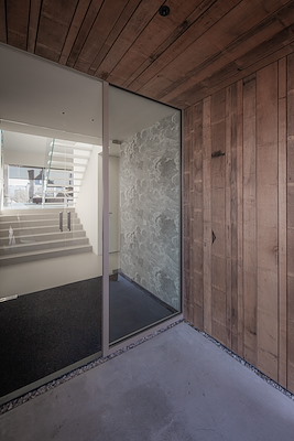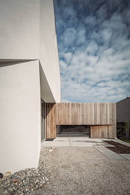 Om het sculpturale karakter van de villa te benadrukken, zijn de ramen diep in het volume geplaatst. De entree kan dankzij een extra houten deur helemaal worden afgesloten, waardoor een volledig gesloten gevel van hout ontstaat. De naastgelegen garagedeuren zijn eveneens van hout, zodat zij compleet opgaan in het gevelbeeld.