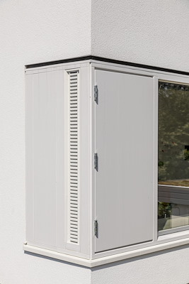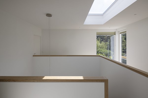 De drie liggende raamstroken van de slaapkamers zijn gecombineerd met een luik, dat naar buiten toe is te openen voor frisse lucht. Twee staande ramen zijn opgenomen in de kern van de opbouw, en zorgen voor ruim binnenvallend daglicht in de vide.