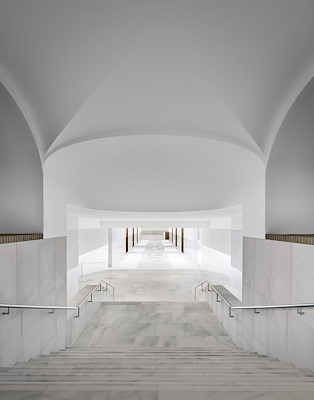eronder. Zo kunnen de bezoekers van beneden het paleis zien en van boven een blik werpen op het museum. Symmetrie en reflecties zijn het verbindende principe, meldt nai010 uitgevers.
