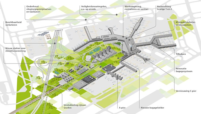 Schiphol wil de komende jaren drie miljard euro investeren in onderhoud en vernieuwing van de luchthaven. Dat geld gaat onder meer naar de bagagekelder, looppaden, klimaatsystemen en vliegtuigopstelplaatsen. De luchthaven acht de investeringen ‘noodzakelijk om de kwaliteit te waarborgen die Schiphol wil bieden aan medewerkers, reizigers en luchtvaartmaatschappijen’.
