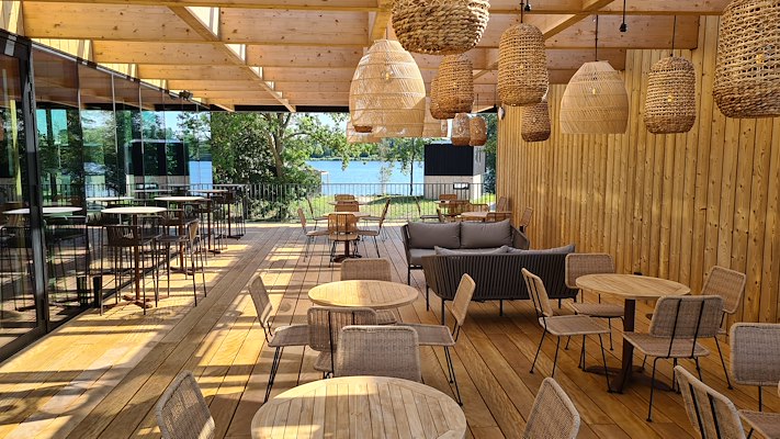 Op de begane grond zijn, naast de kinderopvang, de ruimte voor fietsverhuur, kleedkamers en een opslagruimte ondergebracht. Op de eerste verdieping, die uit twee delen met een open tussenruimte bestaat, bevinden zich de horeca, keuken, personeels- of multifunctionele ruimtes die ook als hotelaccommodatie dienst kunnen doen.