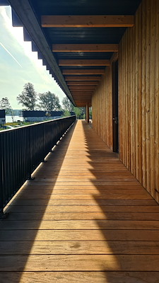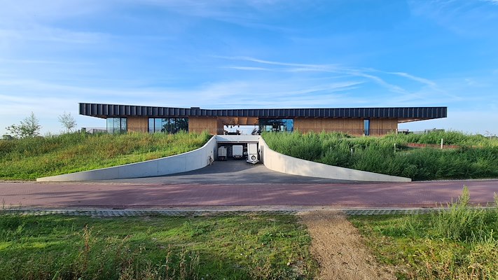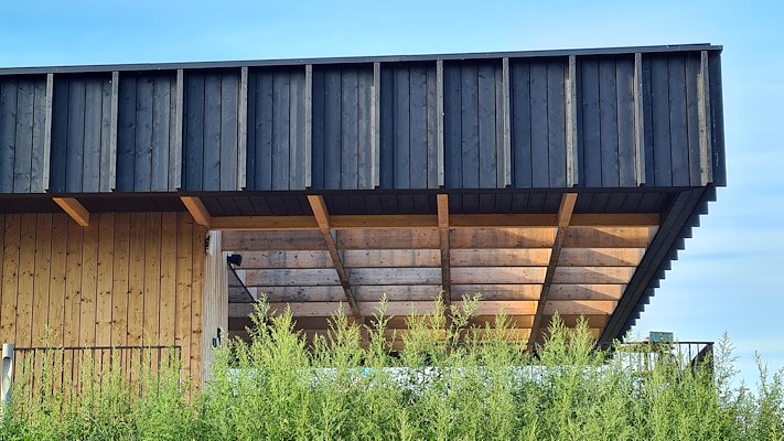 Het forse dak, dat een licht knik aan de bovenzijde heeft, draagt in belangrijke mate bij aan de visuele herkenbaarheid en aantrekkingskracht van het gebouw. De zwarte, houten panelen creëren een duidelijk contrast met de glazen en lichtgekleurde houten gevel van de eerste verdieping.