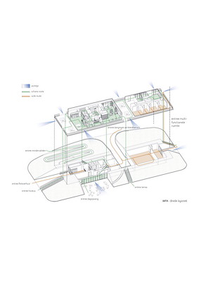 Waar de programma’s op eerste verdieping het contact met de omgeving aangaan zijn de programma’s op de begane grond juist ingetogen en bieden meer sereniteit en rust. Op de begane grond geven vier inhammen in de wallen de verschillende entrees aan. Hierdoor ontstaan er minder conflicten tussen de verschillende gebruikers van en functies in het gebouw. De inhammen benadrukken  tenslotte de verschillende zichtassen in en vanuit het gebouw.