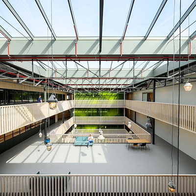 De lichtarmaturen in het atrium en de entreegebieden zijn ‘geoogst’ uit meerdere oude fabrieken. In de grote vide hangen daarom verschillende hergebruikte lampen bij elkaar, die nu zijn voorzien van LED. De nieuwe vloer van de tweede verdieping is gevlinderd zodat een extra vloerafwerking achterwege kon blijven.