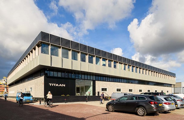 een oude tabaksopslag getransformeerd tot bedrijfsverzamelgebouw De Titaan. Het pand is aan de binnenkant geheel vernieuwd en opgetopt met een extra verdieping, terwijl de gevel zoveel mogelijk werd behouden en versterkt.