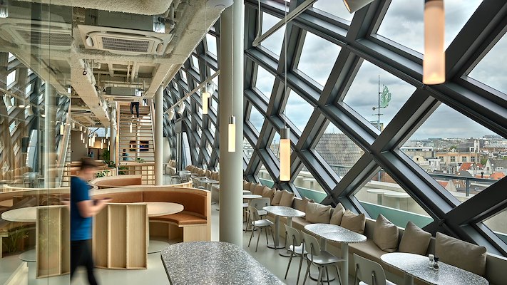 Cartooneske 'grachtenluchtbrug' verbindt Adyen-panden in Amsterdam