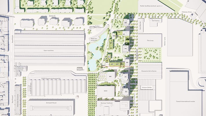 De oostzijde van het perceel, waar het Herman Teirlinckgebouw en Leefmilieu Brussel onderdeel van zijn, is aangeduid als Zone A van het masterplan. Aansluitend op de bestaande gebouwen wordt een aantal grootschalige panden opgetrokken, waaronder de hoogste toren van het project. De nieuwe gebouwen worden voorzien van duurzame constructies, zoals CLT.