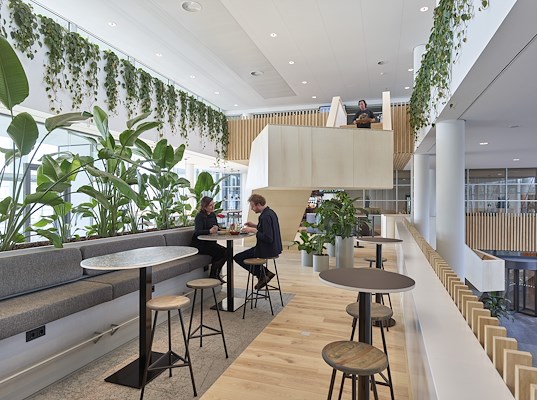 Nabij de entree, in een beveiligd gebied op de begane grond, bevindt zich een werkcafé voor meer informele afspraken die wat korter duren. Het lunchcafé op de eerste verdieping is voor de medewerkers bereikbaar via een uitnodigende, houten trap. Deze ruimte leent zich, naast het nuttigen van een lunch, eveneens goed voor tijdelijke werkplek of overleg en afstemming tussen collega’s. Bij de inrichting is rekening gehouden met deze wisselende vormen van gebruik en verblijf. Er is ruimte voor zowel rust als wat meer reuring. Elke medewerker kan hier een plek vinden die past bij de gewenste manier van werken of ontmoeten.