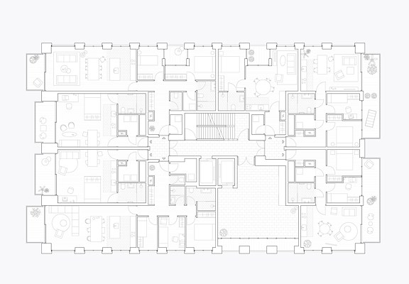 “Door de collectieve ruimtes te verbinden met een aantrekkelijk vormgegeven ontsluiting, wordt de woontoren als het ware opgedeeld in meerdere, kleinere gebouwen. Bewoners worden gestimuleerd om zowel door het gebouw te bewegen als elkaar te ontmoeten”, meldt BETA.