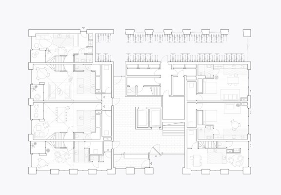 ontworpen gebouw bestaat uit 95 woningen in verschillende typologieën. Bijzonder is de ontsluiting van de woningen: via een lift worden bewoners naar een van de drie strategisch gepositioneerde collectieve ruimtes in het gebouw gebracht. Zij komen dan aan in een geprogrammeerde ‘lobby’, van waar een open trap ze verder voert naar hun verdieping erboven of beneden.