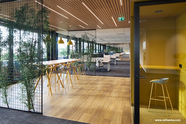 De kantoorruimtes zijn verdeeld over de drie verdiepingen, die alle een eigen kleuraccent hebben. De werkomgeving is opgedeeld in de zones ‘rust’, ‘ruis’ en ‘rumoer’. Deze gebieden zijn onderbroken door strategisch geplaatste bouwkundige kernen, die zijn ontworpen als houten blokken en fungeren als knooppunten tussen de verschillende geledingen binnen het gebouw.