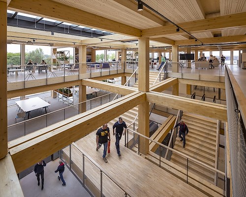 Ook het materiaalgebruik en de uitstraling in het interieur vindt de jury goed gedaan. De transparantie, het ruime atrium en de houten trappen zorgen voor ruimtelijkheid, verbinding en mogelijkheden voor ontmoeting. De architecten hebben een modulair en circulair gebouwencomplex ontworpen, dat een hoge mate van duurzaamheid op vele vlakken combineert met esthetiek en een aangename werkomgeving.