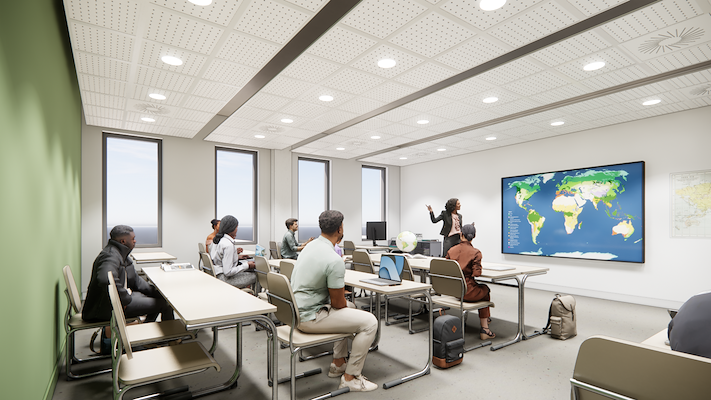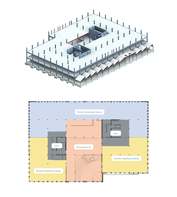 Om veranderingen in het onderwijs eenvoudig te kunnen accommoderen heeft Architecten|en|en een zo flexibel mogelijke structuur voor het gebouw ontworpen. Door de vaste functies, zoals toiletten en installaties, te clusteren rond de twee trappenhuizen, blijft de ruimte langs de gevel overal flexibel in te delen.