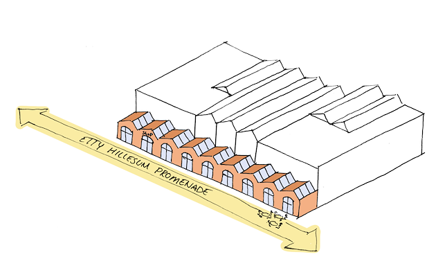 de Etty Hillesum Promenade ontworpen: een lager bouwdeel, voorzien van sheddaken, waarin het praktijkonderwijs zich aan de stad toont.