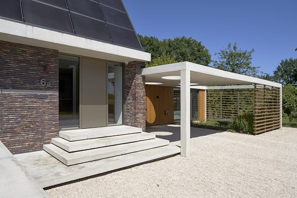 Waar de achterzijde van het huis de natuur laat binnenstromen, is de voorgevel juist relatief gesloten. Dit karakter sluit goed aan bij de sfeer van het bestaande dorpslint. Vanuit de gedachte van aansluiting is ook gekozen voor een kapvolume dat steil is aan de zuidwestzijde, maar aan de noordoostkant flauwer afloopt. Het steile dak aan de straatzijde bestaat volledig uit naadloos op elkaar aansluitende zonnepanelen. In het dak aan de achterzijde is een ruime, horizontale uitsparing met dakvensters gemaakt. Hierdoor valt daglicht tot diep in de woning naar binnen.