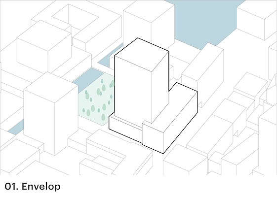 De 22 verdiepingen hoge toren is verder opgebouwd uit blokken die geleidelijk groter worden richting de top. De gevarieerde gevels en buitenruimtes onderstrepen de diversiteit van de appartementen binnen. De onderste helft van de toren, met de middensegment huurwoningen van het project, is verbonden met de gemeenschappelijke dakterrassen bovenop de plint.