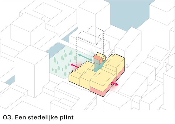 Langs de Rudi van Dantzigstraat bestaat de plint van het gebouw uit blokken van drie tot zes verdiepingen. Hier zijn ook een aantal dubbelhoge ruimtes opgenomen voor winkels en cafés. Aan de kant van het stadspark is de plint verder onderverdeeld om een aantal stadswoningen te maken. Centraal hier ligt een gemeenschappelijke kas en brede groene trap. “Op deze manier wordt het groen van het park naar boven geleid tot aan een binnenplaats op de eerste verdieping in het hart van het perceel.”