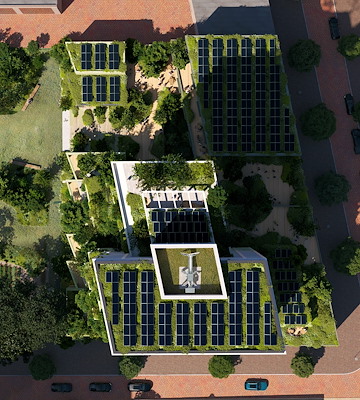 Veel van deze dakterrassen zijn voorzien van pergola's die zonnepanelen ondersteunen, waardoor multifunctionele plekken ontstaan. Hier gaat ontspanning samen met energieopwekking. De gevel van de toren is voorzien van een ander type zonnepaneel, gebruikmakend van gebouw-geïntegreerde fotovoltaïsche cellen (BIPV's) die zonne-energieopwekking combineren met een palet aan kleurtinten.