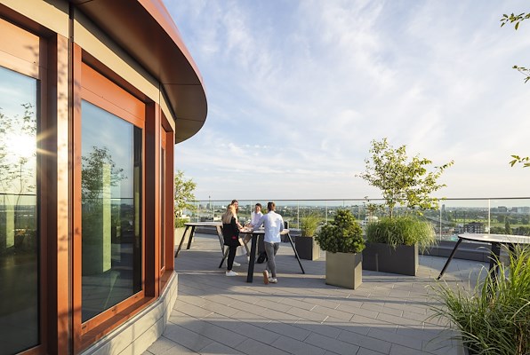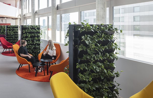 Bij de organisatie van de plattegronden zijn de atria belangrijke elementen. Het zijn focuspunten voor specifiek programma en ze zorgen voor verbindingen en betere oriëntatie in het interieur. De verschillende atria bieden, naast individuele werkplekken, informele werkruimtes en breakout-ruimtes voor ontmoetingen, vergaderingen en koffiepauzes. De individuele kantoren zijn licht en flexibel in verschillende configuraties in te delen. Dankzij die flexibiliteit en de omkeerbaarheid kan ingespeeld worden op toekomstige eisen. Met deze flexibele mogelijkheden en de atria wordt tevens het onderliggende concept van een verticale campus verder versterkt. Niet de rationaliteit van een efficiënt kantoor maar het creëren van een sociale, gezonde en inspirerende werkomgeving is hier leidend.