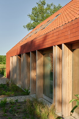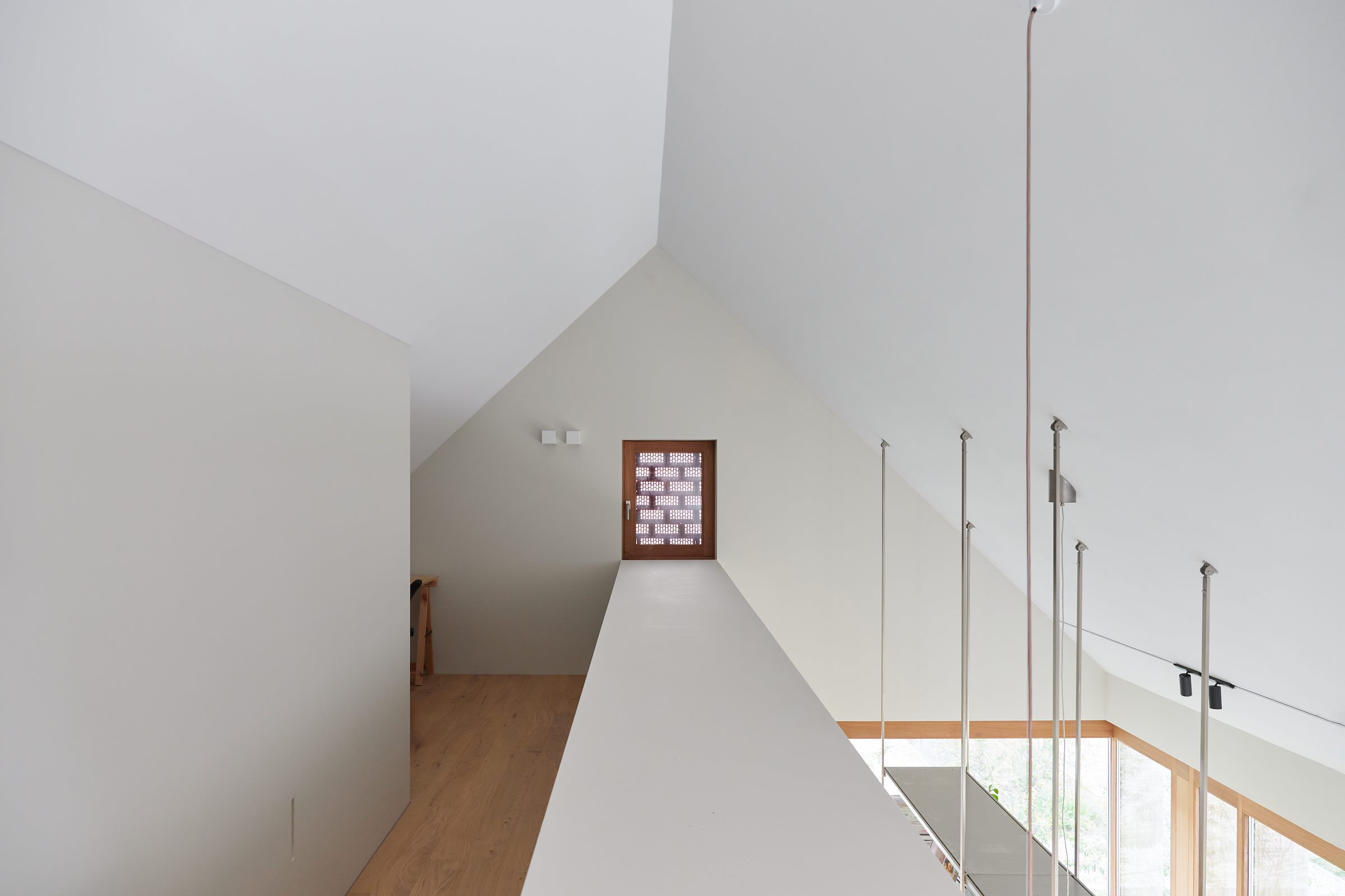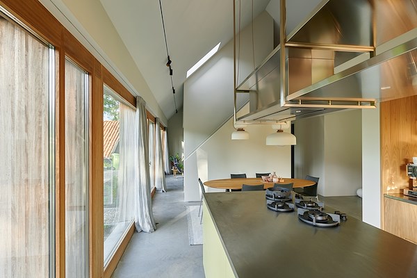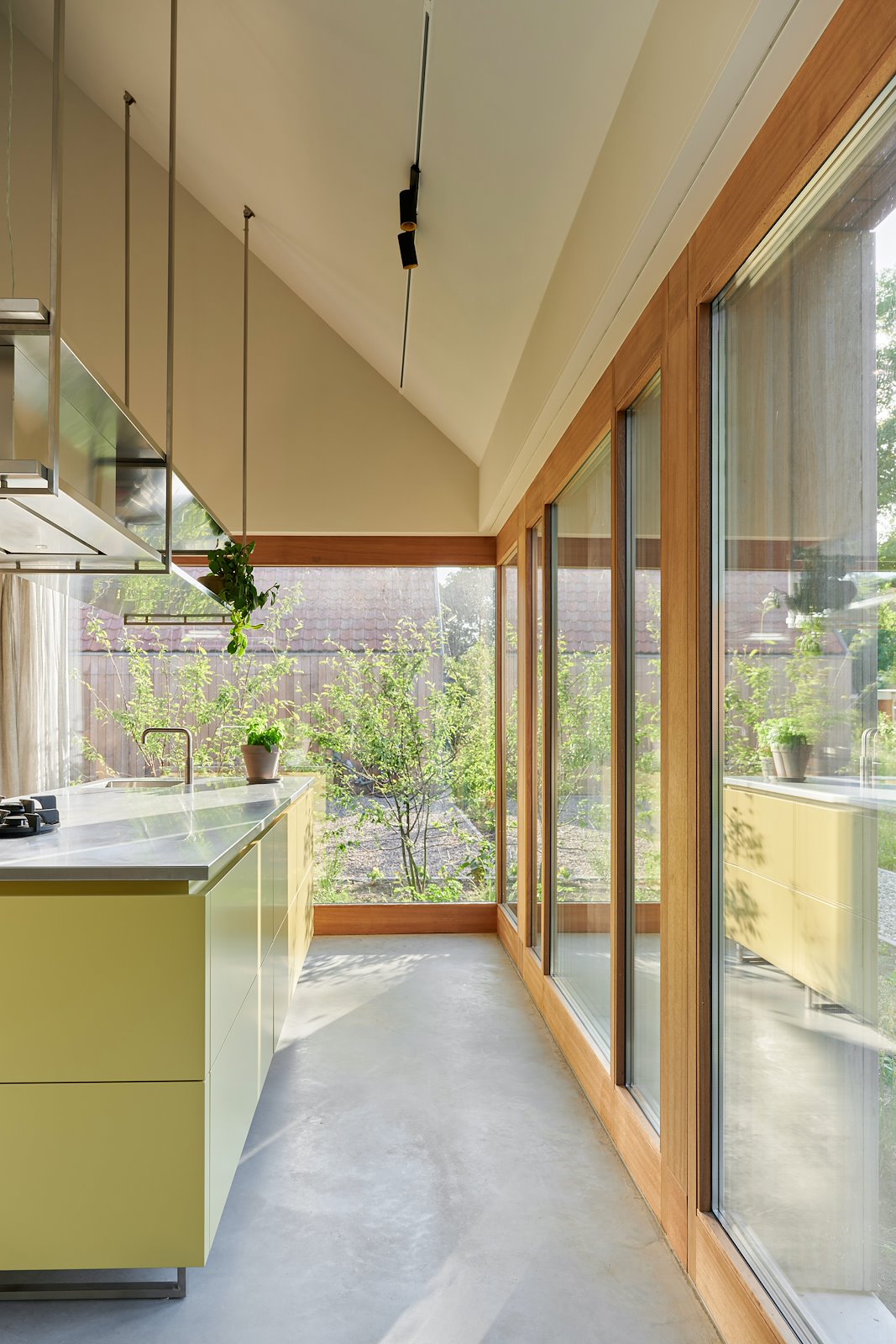 “Daar waar we het in de plattegrond wenselijk vonden, hebben we op eigentijdse wijze nieuwe gevelopeningen toegevoegd in de bestaande gevels. De grote, nieuwe kozijnen zijn weggedetailleerd achter de bakstenen, zodat er een contrast ontstaat met de nadrukkelijk wel zichtbare, bestaande witte stalen kozijntjes”, gaat het architectenbureau verder. “Op andere plaatsen in de gevel hebben we, waar nodig, juist bestaande openingen ‘dichtgezet’. Het dichtzetten is gebeurd op dezelfde wijze als waarmee de gesloten delen van de nieuwe gevels gemaakt zijn, namelijk met bakstenen op hun kant.”