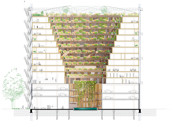 In het gedeelte erboven worden in meerdere lagen diverse publieke voorzieningen geprogrammeerd, zoals een theater, co-working ruimtes commerciële ruimtes en een gezondheidscentrum. Vanaf maaiveld wordt middels een luchtbrug een uitnodigende voetgangersroute toegevoegd, die de bezoekers door de kruinen van de bomen in het omliggende park naar de publieke functies leidt en waardoor een verhoogde, levendige plint ontstaat.