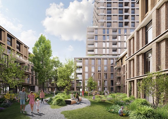 De woongebouwen bouwen af richting de hoven, op het dek wordt een groen landschap gerealiseerd