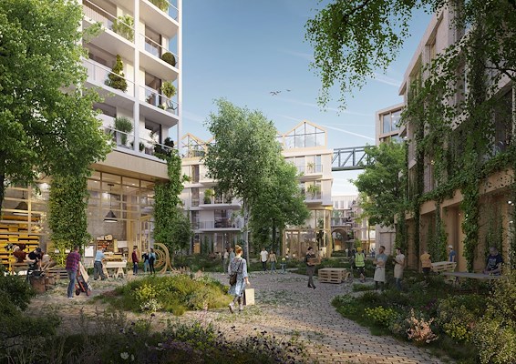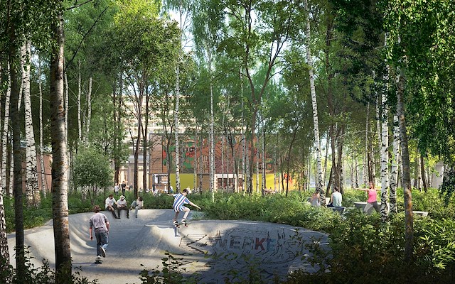 Het plangebied krijgt een groene inrichting. Het landschapsontwerp van LOLA Landscape Architects is gebaseerd op de principes van ‘urban rewilding’, waarmee delen van de openbare ruimte omgezet worden in natuur. Wat nu grotendeels asfalt is, wordt onderdeel van een groot natuurlijk ‘canvas’ dat het hele gebied bestrijkt.