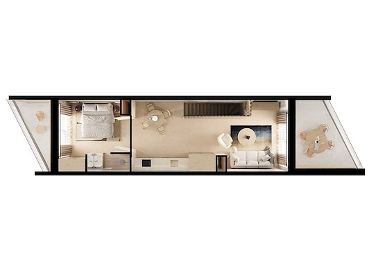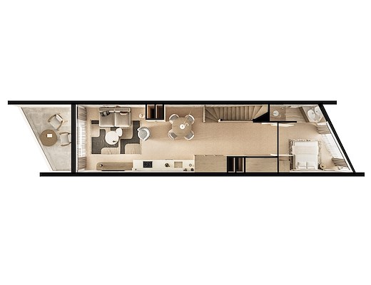 Het ontwerp is naar wens van de gemeente Terschelling en H+N+S landschapsarchitecten gevormd door aspecten als uitzicht, zon, wind en het landschap met zijn hoogteverschillen. Het volume met de duplexappartementen staat diagonaal ten opzichte van het hoofdvolume, waardoor de bewoners naast optimaal zicht privacy genieten omdat ze niet in het blikveld van de hotelgasten zitten. Daarnaast staan de terrassen van de appartementen op deze manier uit de wind.