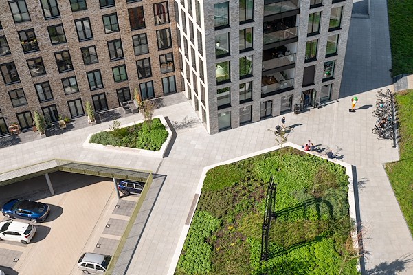 Huisjes en open trappen vormen voetgangerstoegang tot parkeergarage Marnix
