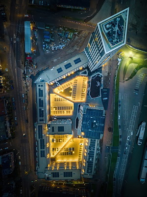 De bijgevolg scherpe punt van het volume begeleidt enerzijds de toegang tot de Waalhaven en anderzijds de weg naar het stadscentrum. In de zijde langs de Waalhaven is over de eerste lagen een schuine sparing in het blok gemaakt. De tegenoverliggende zijde van de toren heeft juist twee getrapte, eveneens schuine setbacks, die het gebouw naar boven toe slanker maken en bijdragen aan een intrigerend totaalbeeld.