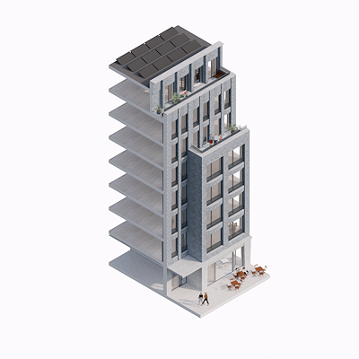 De gebouwen ‘staan in dienst’ van de openbare ruimte, zoals de architecten het verwoorden, en moeten zorgen voor een menselijke schaal. Ze trappen naar boven toe terug en zijn gestoken in zachte pastelkleuren. Hoewel het materiaalgebruik per gebouw verschilt, zorgen de kleuren voor eenheid. In de plinten komen verlevendigende functies als horeca en fietsvoorzieningen.