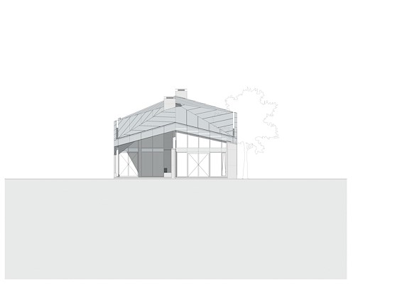 Dit basement, een verwijzing naar het nabijgelegen fort, biedt beschutting en privacy ten opzichte van het openbare terrein en de openheid van de tuin. Een transparante tussenlaag van glazen gevels geeft de bewoners royale vergezichten over het water. Het metselwerk zet zich voort in de twee schoorstenen, die boven het grijsglanzende dak verrijzen.