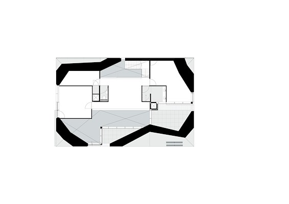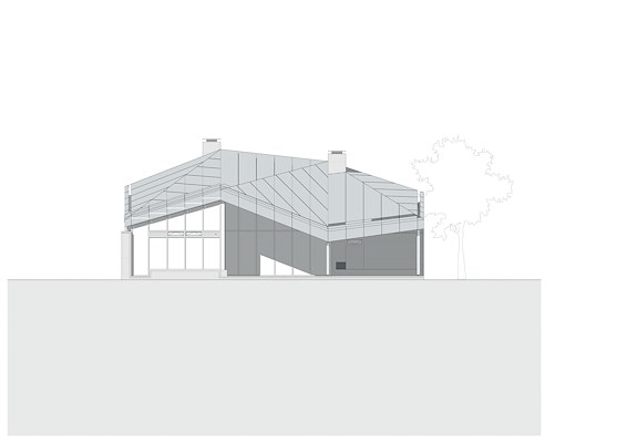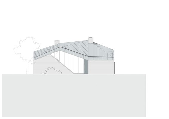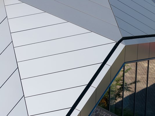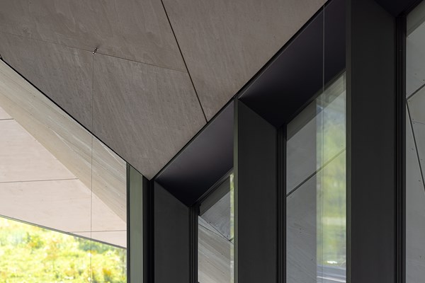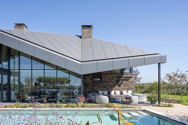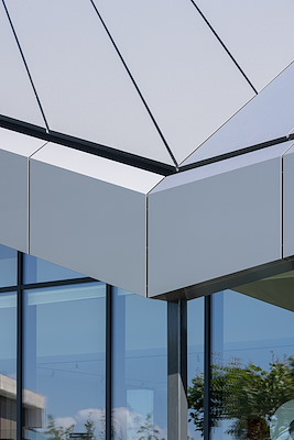 Het vrij gevormde dak is gerealiseerd in aluminium composiet. De overstekken, hellende daken en in- en oplopende dakranden bieden bescherming tegen de warmte en instraling van de hoog staande zomerzon, maar laten het licht van de lagere winterzon diep in de woning doordingen. De verlopende dakranden versterken de expressiviteit van het dakvlak. Waar nodig herbergen ze de zonwering.