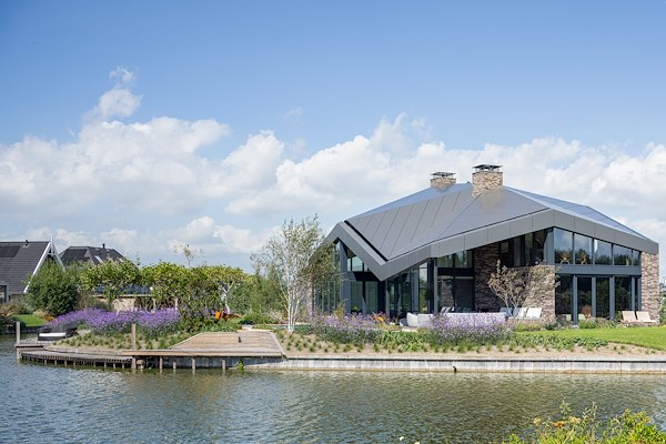 Onder het overstek ligt beschut een royaal terras met buitenhaard, direct grenzend aan de open, dubbelhoge leefruimte met woonkamer en keuken. Aan de ander zijde liggen op de begane grond de slaapkamer en badkamer, met eigen zicht door de tuin richting het water. Op de verdieping geeft een open entresol sfeer en extra ruimte aan de woning. Aangrenzend bevinden zich twee slaapkamers met badkamer en opslagruimte.