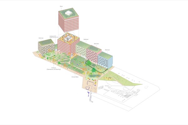 MVRDV en LOLA Landscape Architects hebben het ontwerp gepresenteerd voor een bouwblok met ongeveer vijfhonderd woningen en andere functies in Düsseldorf. Het plan Grüne Mitte is in samenwerking met omwonenden en andere betrokkenen uit de omgeving tot stand gekomen, waaronder de bewoners uit de achtergelegen Kiefernstrasse, dat sinds de jaren tachtig geldt als het krakersbolwerk van de stad.