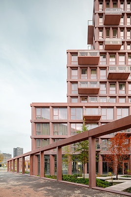 Highnote is een zachtrode woontoren op een plint van stadskamers
