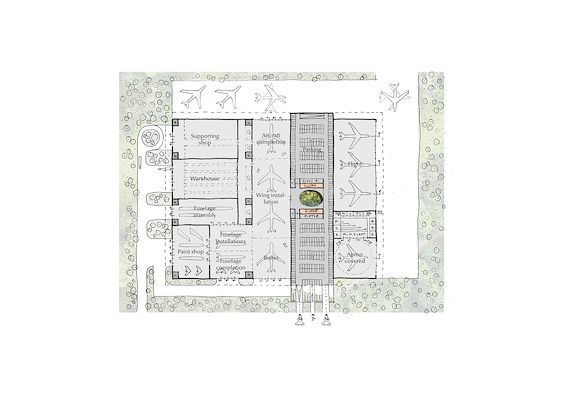 Het gebouw bestaat uit drie hoofonderdelen: de assemblagelijn, de kantoren en het zogenoemde vliegbedrijf. Dit laatste richt zich op de klant en omvat onder meer hangars en een evenementencentrum. Het compacte volume is duurzaam en faciliteert zoveel mogelijk ontmoeting en uitwisseling.