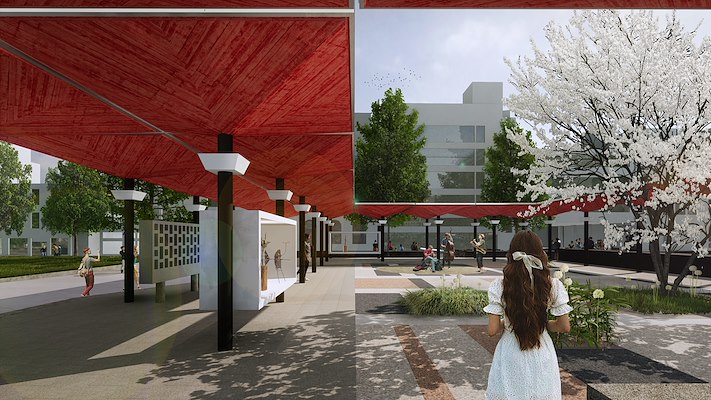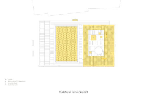 Het rijksmonument wordt gerestaureerd, waarbij verdwenen elementen terugkeren. De vitrines van de pergola komen vrij hangend tussen de stalen kolommen van de paraplu’s, terug. “De vitrines vormen een aanleiding de patio te programmeren en ontmoeting te stimuleren. Ook zal de verlichting van de paraplu’s hersteld worden zodat het ensemble jaarrond in de avondsituatie een prominente en sociaal veilig ontmoetingsplek vormt op het Gele Rijders Plein”, meldt opZoom architecten.