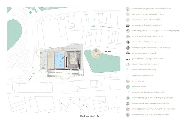 Het plein krijgt tevens nieuwe bestrating; de nieuwe vloer wordt ingericht met een vormentaal die teruggrijpt op de Wederopbouwperiode. Het zijn lijnen, vlakken en punten die samen het grote vlak van de pleinvloer definiëren en kaderen, aldus opZoom Architecten.