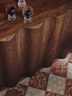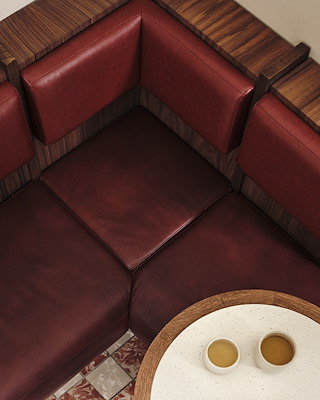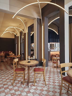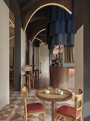 Alle gebieden van de brasserie worden visueel verbonden door pendelarmaturen die met hun gebogen vorm verwijzen naar kloosters, legt de ontwerpstudio uit. In het hart van de ruimte bevindt zich de bar, die een ode aan de cinema en de opvoeringskunsten vormt. Blikvangers zijn hier de drielaags fluwelen gordijnen in indigo, en het barfront waarvan het eikenhout golft als een gordijn.