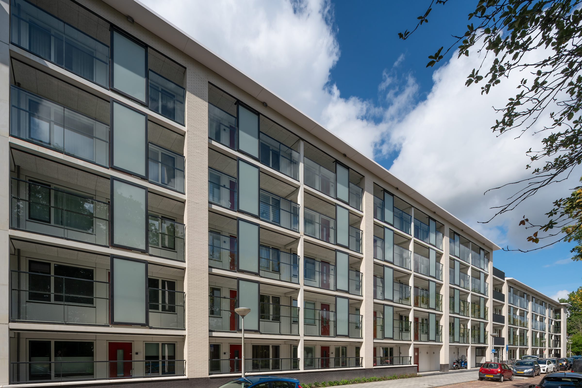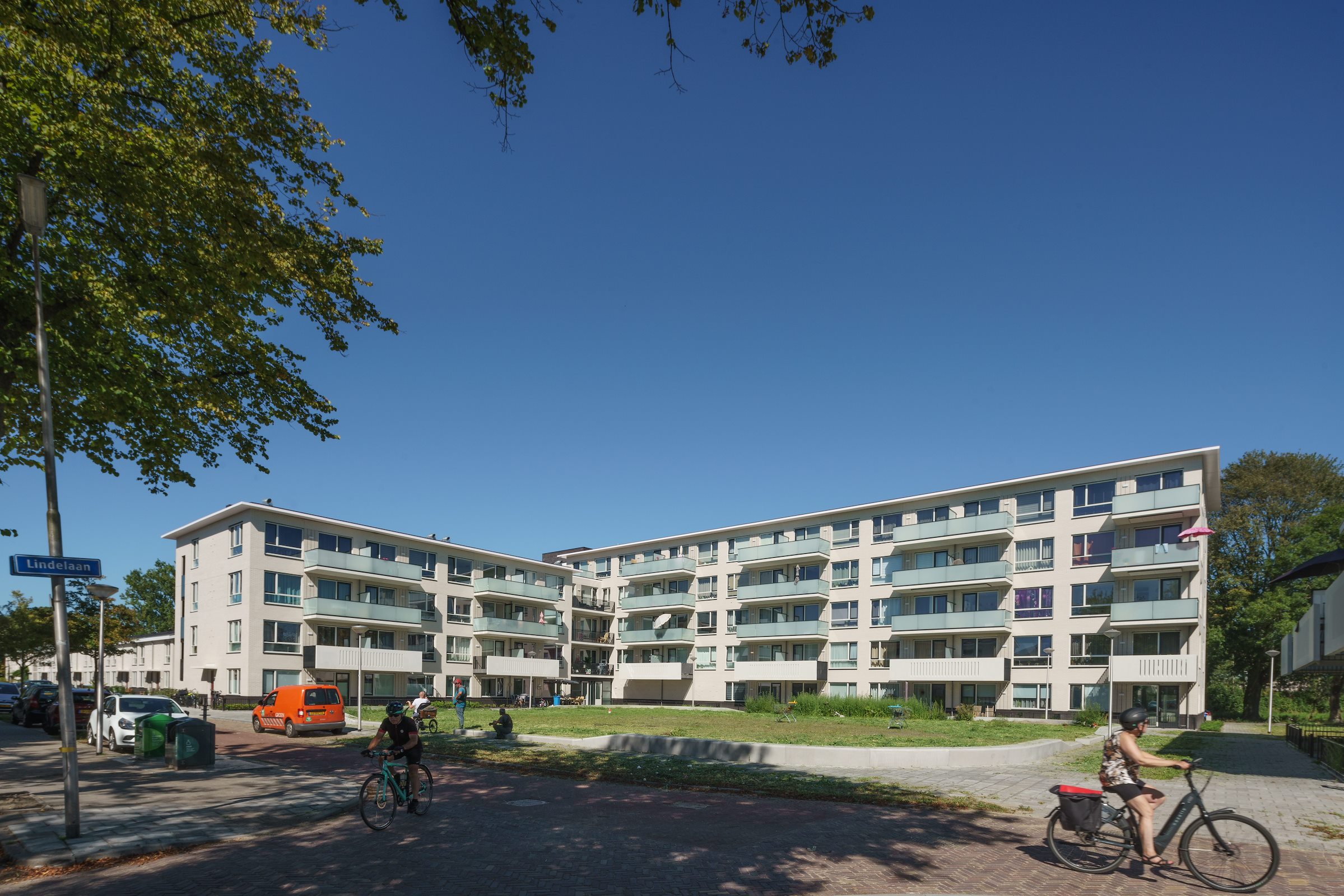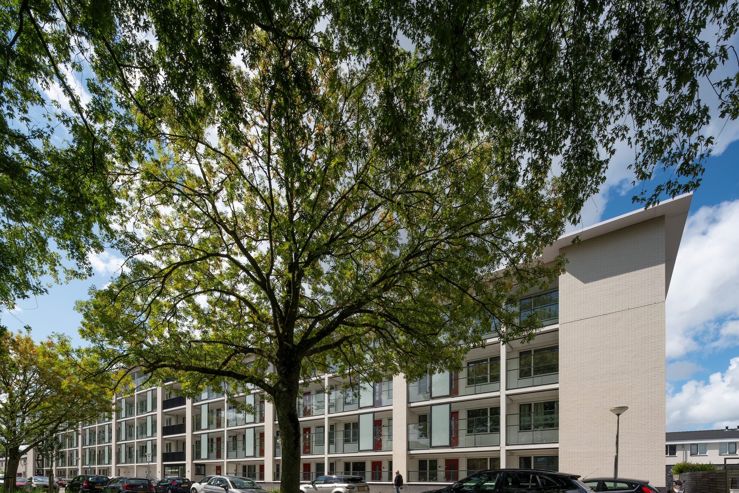 “In de jaren 50, toen de Bomenwijk werd gebouwd, hadden weinig mensen een auto en zeker niet de mensen die hier woonden”, zeggen de architecten. “Begin 21e eeuw staan de straten vol geparkeerde auto’s, behoorlijk lelijk in het straatbeeld. Door minder woningen te bouwen nam de parkeerdruk flink af en konden de straten weer luchtig en ontspannen worden vormgegeven.” Deze ‘verdunning’ maakte het tegelijkertijd mogelijk de karakteristieke open bouwblokstructuur, met doorkijkjes tussen de blokken, te handhaven.