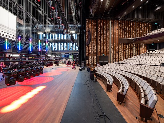 Voor de grote zaal heeft NOAHH gekozen voor een afwerking in bamboe in combinatie met een lichte, glanzende stoffering voor de stoelen. De bamboe wandafwerking heeft een perforatie in de vorm van kleine blaadjes, een verwijzing naar de kastanjebomen op de Parade. “Het geluid van het podium wordt via de wanden weer de zaal in gereflecteerd, deze perforaties helpen om het geluid te verstrooien”, licht Fransen toe. De perforaties zijn van achteren aangelicht. In combinatie met de lichte, glanzende stoffering van de stoelen is daarmee een sprankelende zaal ontstaan.