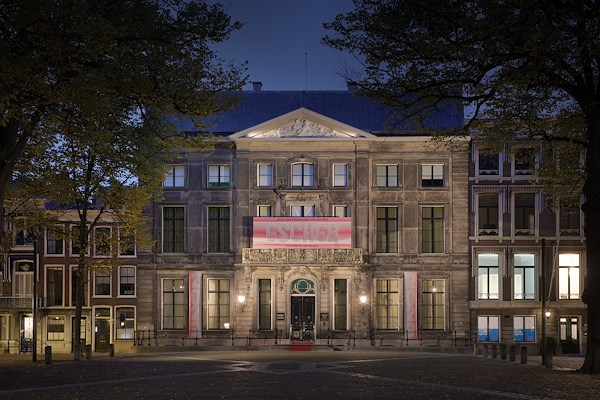 Escherpaleis met nieuwe verlichting (de projector van het linkerdeel van de gevel is hier defect)