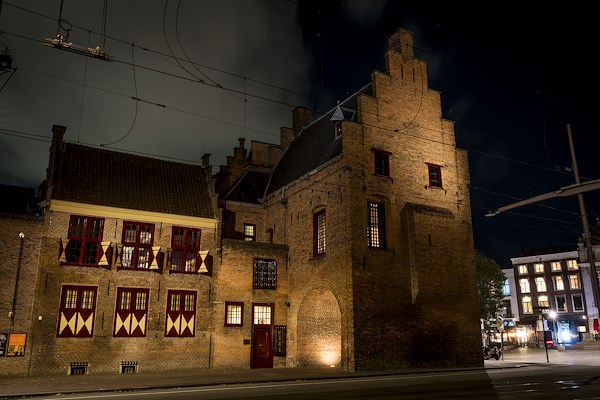 ). De Gevangenpoort fungeerde destijds dus ook echt als een poort. Ter herinnering aan het feit dat de zijgevel toen niet zichtbaar was door de panden ernaast, hebben we die kant van het gebouw donker gelaten. Je zou kunnen redeneren dat het de belangrijkste gevel is, maar dan benader je het gebouw eerder als object dan dat je recht doet aan de geschiedenis. Wij vonden het juist mooi om de historie in beeld te brengen.”