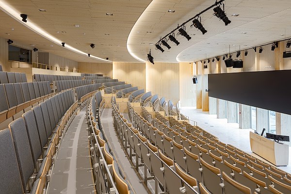 De collegezalen boven de grote zalen hebben overspanningen van liefst 9.2 meter. Dankzij de CLT-ribbenvloeren kon worden voldaan aan de eisen voor doorbuiging, trillingen en akoestiek. Door de ribben hoger te maken en verder uit elkaar te plaatsen, kreeg de vloer meer massa voor een betere akoestiek, terwijl de ruimte tussen de balken benut kon worden voor ventilatiekanalen, verlichting en andere technische voorzieningen. Het akoestische houten lattenplafond tussen de balken verbergt de techniek, terwijl de balken zelf in het zicht blijven. Op die manier maakt de houten constructie integraal deel uit van de architectuur.