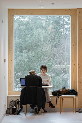 In het nagenoeg energieneutrale gebouw bevinden zich een foyer, auditorium, dertien collegezalen en zelfstudieplekken voor ongeveer duizend studenten. De constructie, wanden, vloeren, trappen, kozijnen en afwerkingen zijn alle van massief hout. Er is een speciaal droogbouwsysteem toegepast, met houten ribbenvloeren (CLT-vloeren die zijn versterkt met balken) die grote vrije overspanningen mogelijk maken die voldoen aan de hoge akoestische eisen die nodig zijn voor het programma.