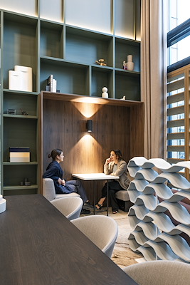 In de ruimte rondom de organische vorm liggen ‘lounge-eilanden’, aangeduid door speciaal vervaardigde karpetten. Tien meter hoge gordijnen dragen, naast sfeer, bij aan een prettige akoestiek. “Hierdoor is het mogelijk om binnen de grote gebaren een fijn plekje te vinden voor een informeel overleg, lunch of werk”, legt Void uit.